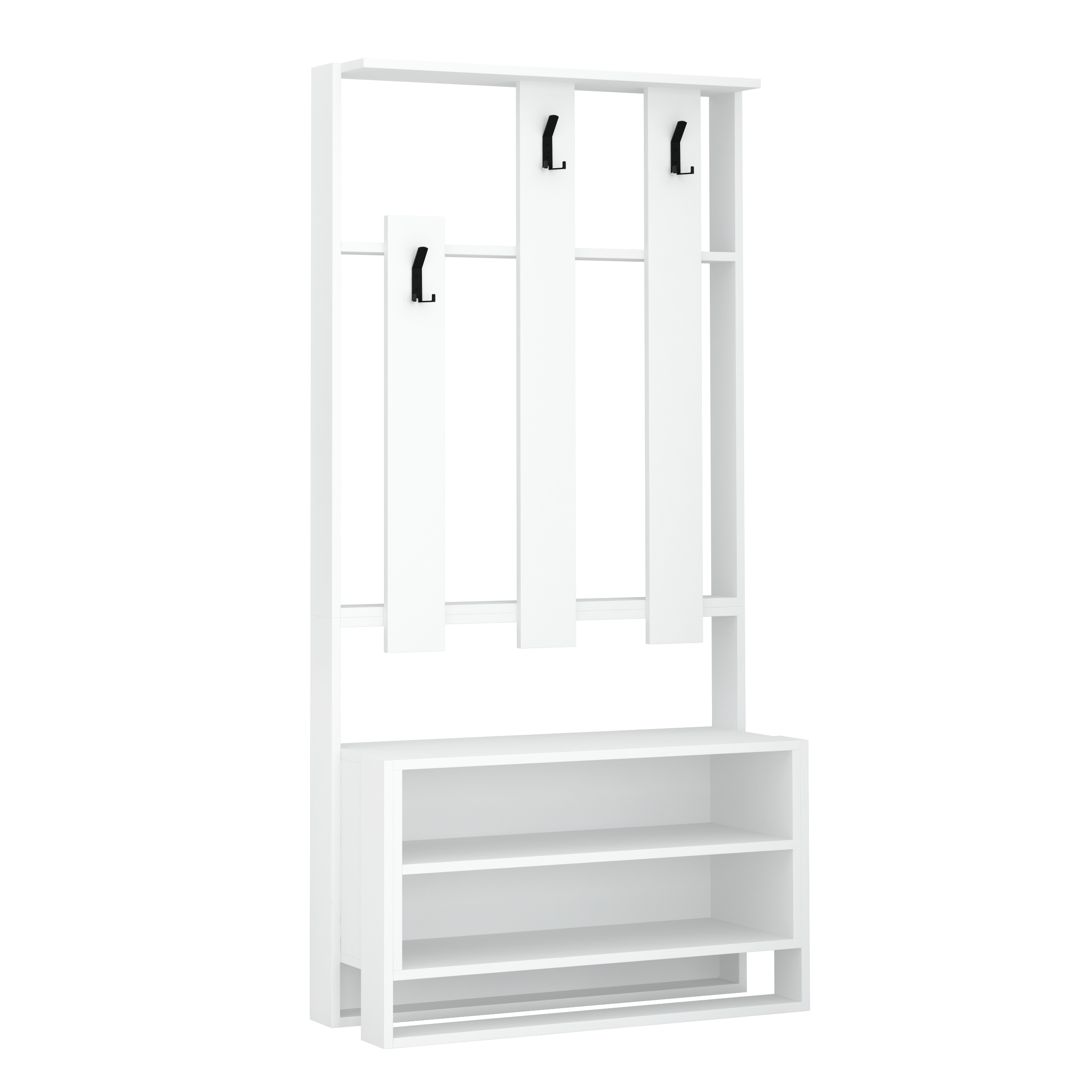 Introducing unique hall stand, perfect for making a standout statement in your home entrance. It offers ample storage space for your everyday essentials. With three hooks and two shelves for coats, hats, bags, and decor, you can keep your space tidy. With space to store up to 8 pairs of shoes, you can keep your footwear organized.